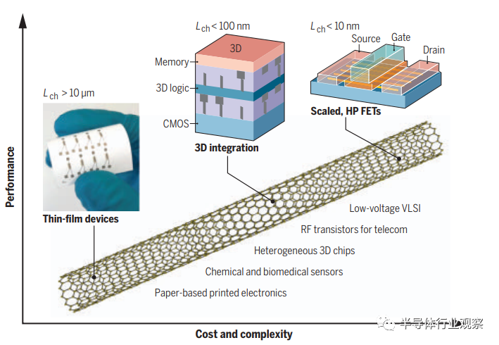圖1所示:碳納米管晶體管的廣泛潛在應(yīng)用。說(shuō)明了碳納米管晶體管的一些最重要的潛在應(yīng)用的設(shè)備性能與成本和復(fù)雜性。應(yīng)用范圍從微型薄膜器件(如印刷電子、生物傳感器)到三維集成BEOL器件(如集成到硅CMOS上的異質(zhì)3D層)和規(guī)模高性能(HP) FET[如低壓超大規(guī)模集成(VLSI)],其性能的提高與集成成本和復(fù)雜性的增加相對(duì)應(yīng)。Lch,通道長(zhǎng)度。