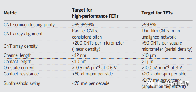 表1:兩個(gè)突出的碳納米管晶體管應(yīng)用的幾個(gè)目標(biāo)指標(biāo)。值是基于實(shí)現(xiàn)最佳性能的近似值。值得注意的是,盡管其中一些目標(biāo)已經(jīng)實(shí)現(xiàn),但最重要的挑戰(zhàn)之一是同時(shí)實(shí)現(xiàn)它們(例如,高通電電流與低閾值下擺動(dòng),這是一個(gè)衡量調(diào)制電流需要多少柵電壓的指標(biāo))。高性能FET用于服務(wù)器的中央處理單元(CPU)等應(yīng)用,TFTs是用于顯示器背板電子器件的薄膜晶體管。
