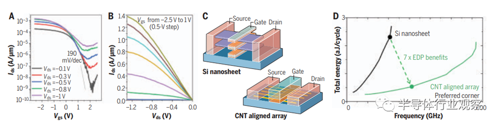 (A和B)每微米約150 CNTs對(duì)齊陣列制備的CNT晶體管的亞閾值(A)和輸出特性(B),可實(shí)現(xiàn)>1 mA μm−1的通態(tài)電流。Ids,漏電流;Vds,漏源電壓;Vgs,柵源電壓。