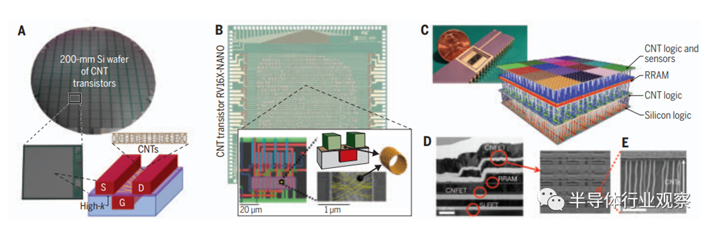 未來(lái)的半導(dǎo)體芯片將超越二維器件的小型化,取而代之的將是三維層的有源器件。由于三維邏輯器件層必須很薄,并且在與后端線(BEOL)布線層(通常<400°C)兼容的溫度下制造,CNT晶體管特別適合3D集成,因?yàn)槠骷圃鞙囟鹊停骷颖 拇蠹s十年前首次展示全碳納米管晶體管計(jì)算機(jī)開(kāi)始,不僅在集成水平上取得了進(jìn)展,而且在設(shè)備多樣性,以及從大學(xué)實(shí)驗(yàn)室到工業(yè)技術(shù)的成熟上都取得了進(jìn)展。