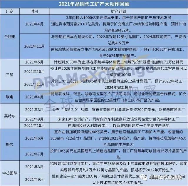 半導(dǎo)體行業(yè)過去兩年的供不應(yīng)求,讓許多芯片制造商們開始大力擴(kuò)產(chǎn)增能。臺積電、三星、聯(lián)電、英特爾、格芯、中芯國際等代工巨頭都相繼宣布擴(kuò)產(chǎn)計(jì)劃。